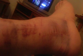 A colleague had urged me to try a new taping system and I had ordered a sample. So when the second degree ankle sprain occurred the Kinesio Tape was at hand. However, I did not use the tape initially. Instead I opted for the more common inelastic taping. I was able to stand, and hobble. After a day my ankle looked as in the picture below. I then tried the Kinesio Tape and to my amazement I could walk- slowly-with remarkably little pain. Since then I have completed several courses in The Kinesio Taping Method and frequently recommend the tape to patients.